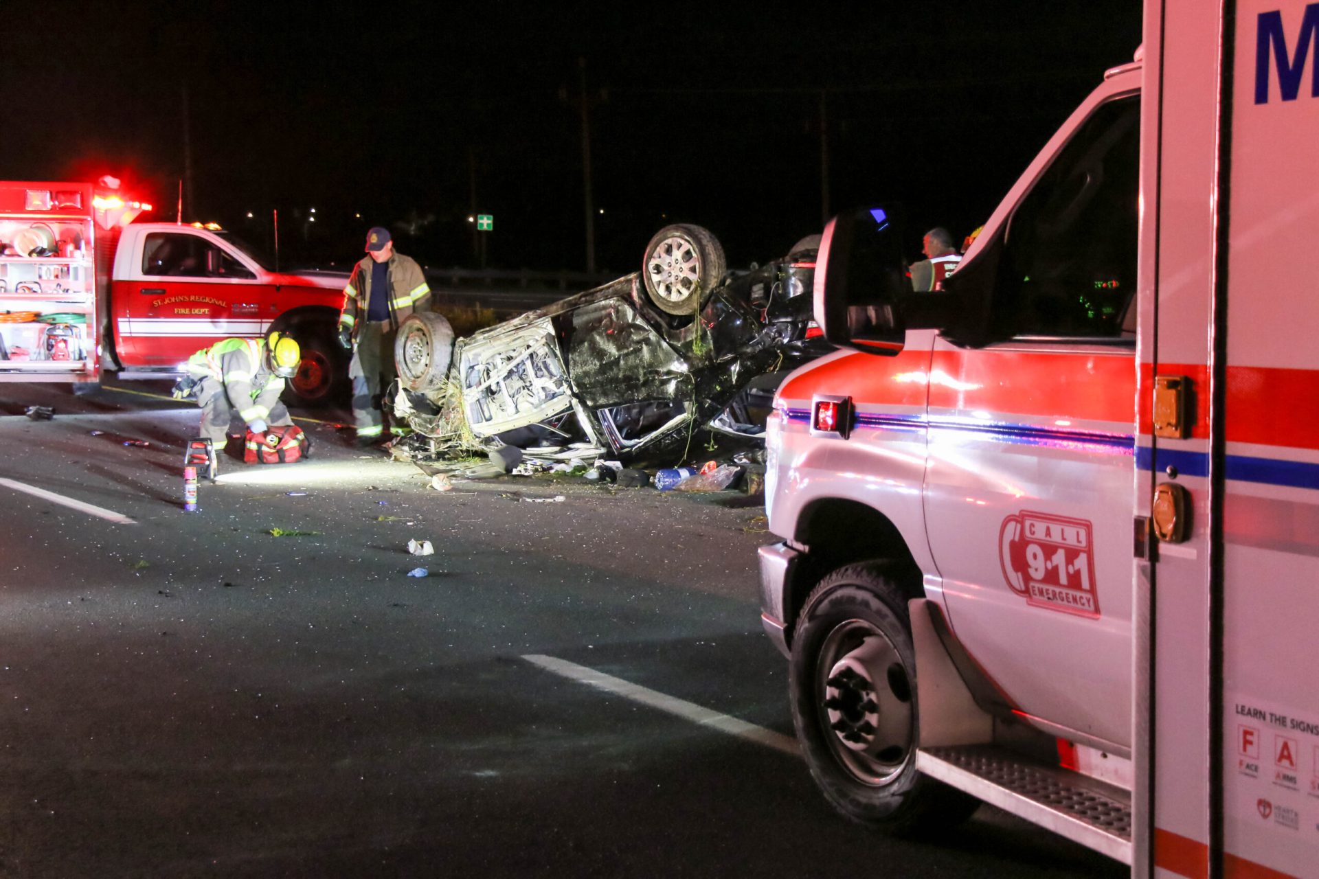 Emergency crews responded to the eastbound lanes of the highway, near Portugal Cove Road, at about 12:15 a.m.. The driver of an eastbound sedan lost control of the vehicle near the exit to Portugal Cove Road southbound. The car entered the median, rolling over several times, before coming to rest on its roof roughly seventy-five metres away.