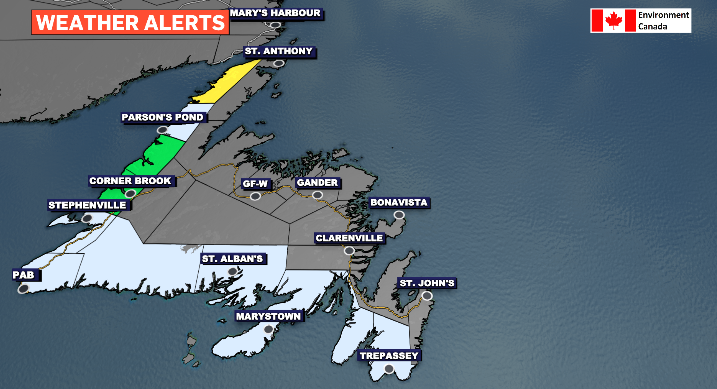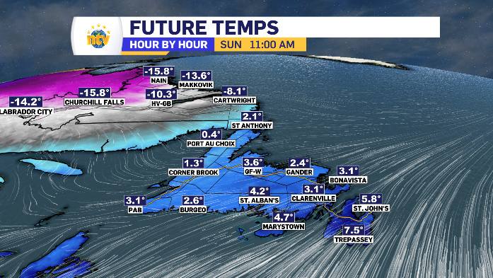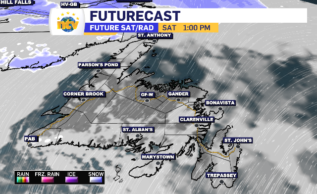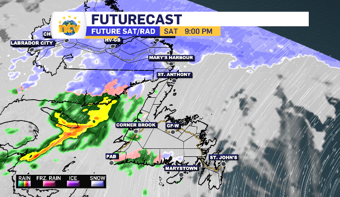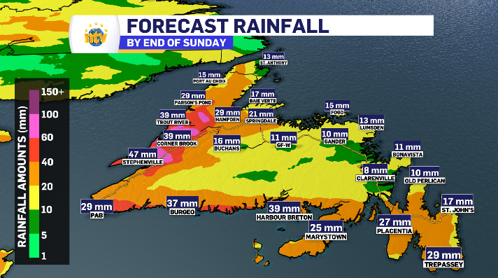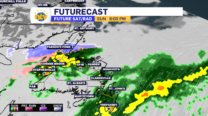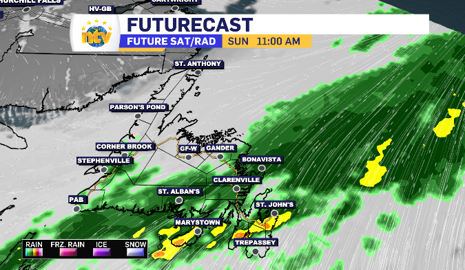 It all starts at midnight along the West Coast and Northern Peninsula. By early Sunday morning the South Coast and Central will be under the rain. By late morning the eastern side of the island is looking to start a 12-hour period of rain. There are a few moments in the afternoon of some on-again-off-again rain in the Metro region, however the Avalon returns to the consistent rainfall come sundown. Of note, some mixed precipitation moves across the Baie Verte Peninsula Sunday evening as a north wind drops temperatures back below zero.