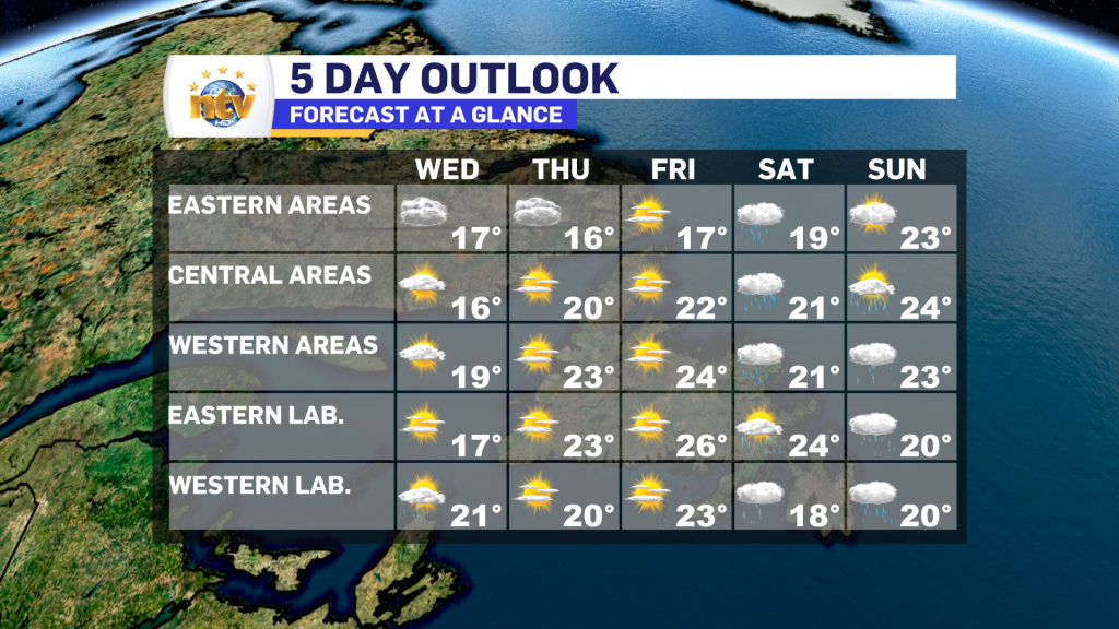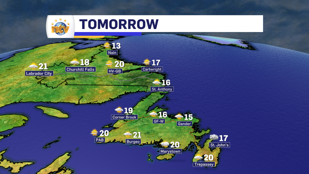 Labrador can expect mostly sunny skies, with highs in the teens to near 20. The cooler readings will be found on the north coast, while the mid to upper teens and near 20 will be found farther south and west.