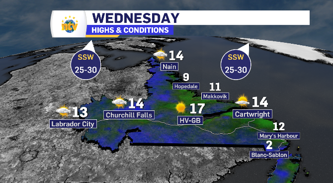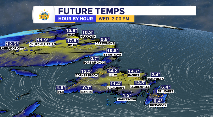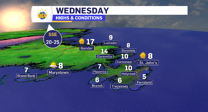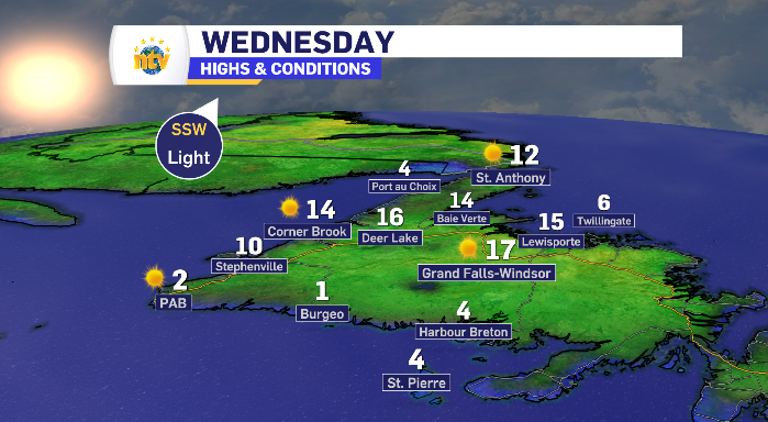 Wednesday’s day time highs across Newfoundland and Labrador