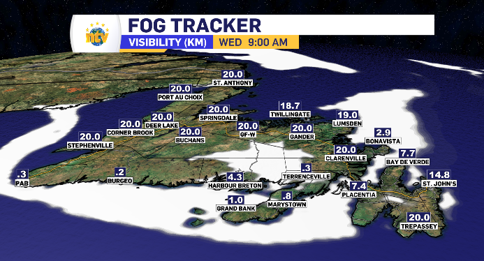 With south winds warming many communities, it does wrap part of Newfoundland in fog at various points Wednesday. That fog lingers longest in, and there for effects specifically, Newfoundland’s south coast.