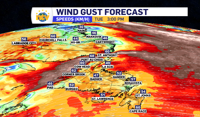 It just so happens that the cooler air west, and now south of us, arrives via the wind. Blowing, of course, west and southwest through Tuesday. That wind comes with a bit of a pace as well, topping in the high 70’s and low 80’s around the province’s coastlines specifically on the backend of Tuesday.