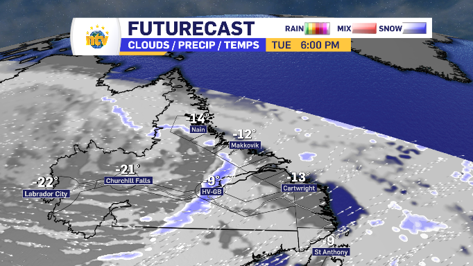 Labrador is facing an equally chilly Tuesday, even when relativity and seasonal averages come into play. The day starts with sun for all. However, there is front of cloud with a band of flurries moving west to east, showing up in Labrador City early in the morning, reaching Happy Valley-Goose Bay by the supper hour and finishing the evening along the coastline. No community should see an accumulation of more than a centimetre or two.